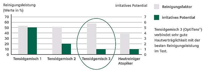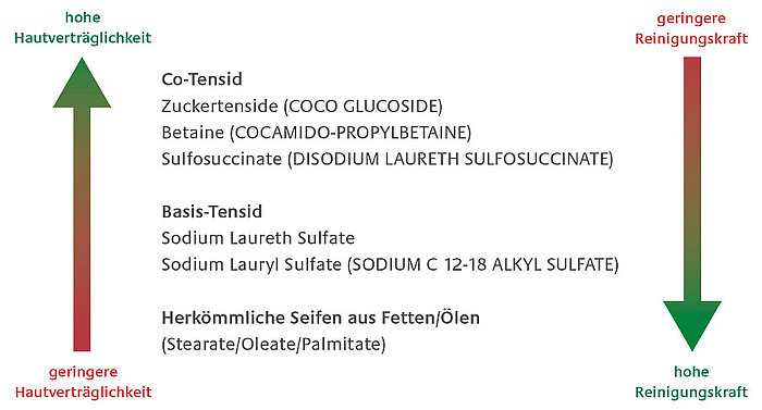• Normalerweise sind Tenside (die reinigenden chemischen Inhaltsstoffe) entweder stark reinigend und wenig hautverträglich oder gut hautverträglich, aber nicht gut in ihrer Reinigungswirkung.